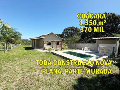 Chácara de 1.350 m² com casa sede NOVA de laje com 2 quartos, sala, cozinha, banheiro, lavanderia, varanda; área de lazer com piscina churrasqueira e área gourmet; frente e 1 lateral murados, gramado, jardinado, frutíferas.