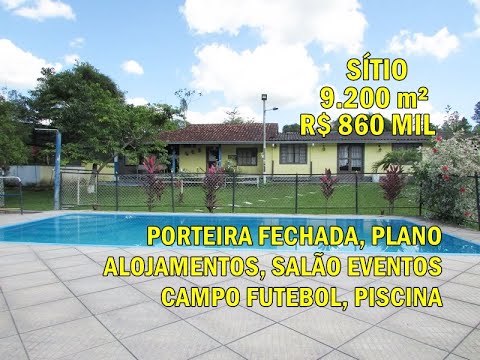 Sítio de 9.200 m² 1 casa de 1 quarto, cozinha e banheiro; 4 alojamentos com 80 vagas; 1 cozinha com fogão industrial, geladeira, 1 bebedouro elétrico 100 litros de água, freezer, panelas, pratos e talheres; 2 galpões/salões para eventos com cadeiras e mesas plásticas; área de lazer com 2 piscinas, playground, campo de futebol, campo de vôlei, área gourmet com 2 churrasqueiras, espaço para jógos com sinuca + totó + ping pong; 9 banheiros cercado, pequena área de pastagem, jardinado, frutíferas.
