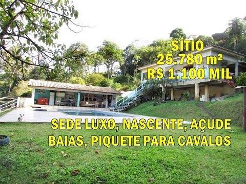 Sítio de luxo com 25.780 m² com rio na divisa, casa sede composta por 3 quartos, sendo 1 suíte, sala ampla, cozinha, banheiro social, varanda, área de serviço; casa de caseiro/hóspedes; área de lazer com piscina de alvenaria com linda vista, área gourmet com churrasqueira + forno e fogão à lenha; lago repleto de peixes com água correndo direto, nascente; baias para cavalos, quarto de ração, 2 galpões para maquinários; pastagem piqueteada para cavalos; pequeno horto, galinheiro, viveiro, canil; cercado, gramado, jardinado, diversas frutíferas.