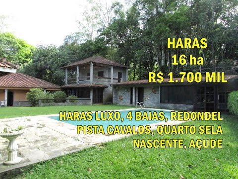 Haras de luxo com 3.51 alq (17 ha = 170.000 m²) com casa sede de 3 quartos, sendo 2 suítes, sala ampla com lareira, cozinha, closet, banheiro social, varandas; suíte externa para hóspede; casa de caseiro com 3 quartos + área de lazer com churrasqueira; área de lazer com piscina de alvenaria, sala com hidromassagem com linda vista para a piscina, sauna, quiosque, salão com churrasqueira e fogão à lenha, cozinha gourmet com 2 ambientes, salão de jogos, casa da árvore, estúdio musical/escritório, banheiros; pista para cavalos, redondel, piquetes reguados, 4 baias, quarto de ração, quarto de cela; galpão para maquinários, depósito de ferramentas, canis; plantação com 30.000 pés de eucalipto; açude com muitos peixes, nascente; trilhas e estradas em meio a mata para passeios; gramado, jardinado, frutíferas diversas; mata reserva.  Imóvel muito bem localizado em região de sítios e fazendas.